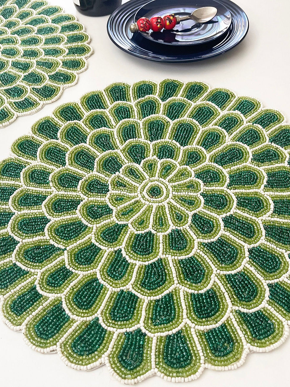 Set of 4, Handmade beaded placemat, tablemat, 14 inch, green bead