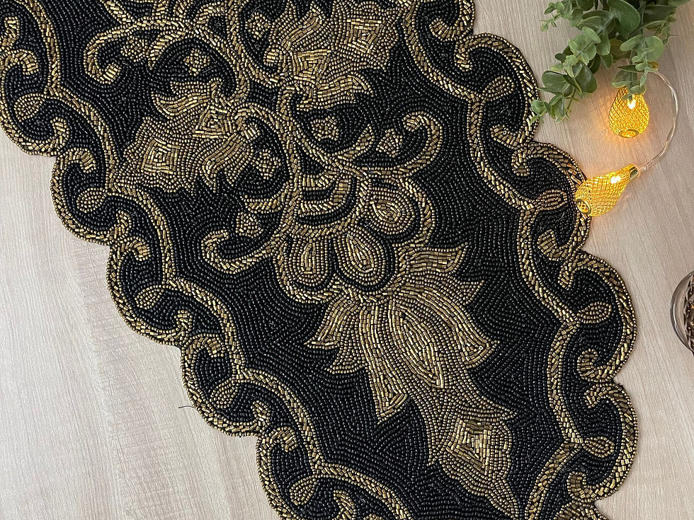 Handmade table runner, black and gold beaded table runner, 13x36inch